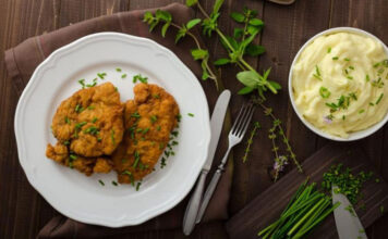 Πουρές πατάτας με τραγανό σνίτσελ κοτόπουλο