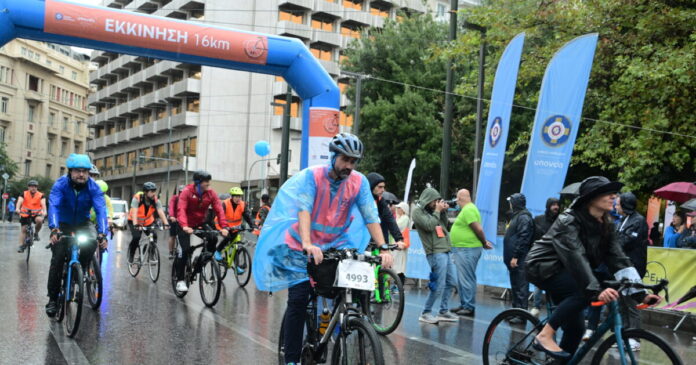 Ο «29ος Ποδηλατικός Γύρος Αθήνας» διεξάγεται υπό βροχή με τους συμμετέχοντες να έχουν κατακλύσει με τα ποδήλατά τους το κέντρο της πρωτεύουσας για να συμμετάσχουν στον αγώνα.
