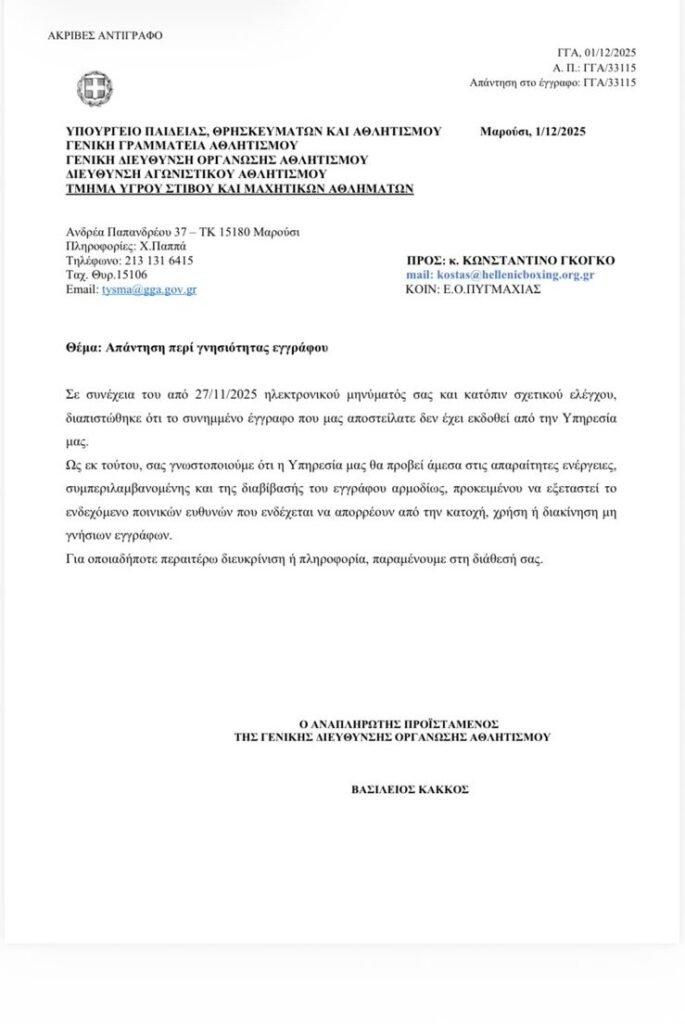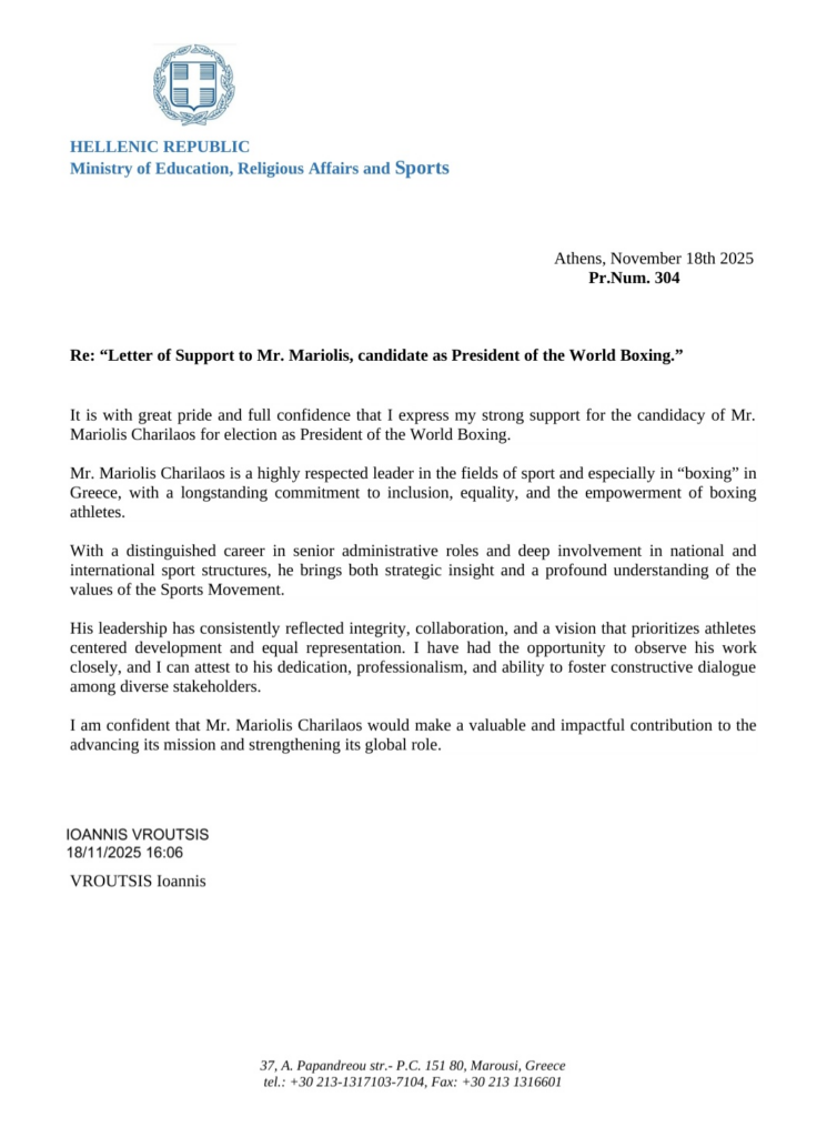 Η επιστολή του Αναπληρωτή Υπουργού Αθλητισμού, Γιάννη Βρούτση στη World Boxing για υποστήριξη από την ελληνική πολιτεία της υποψηφιότητας που έθεσε ο Χάρης Μαριόλης