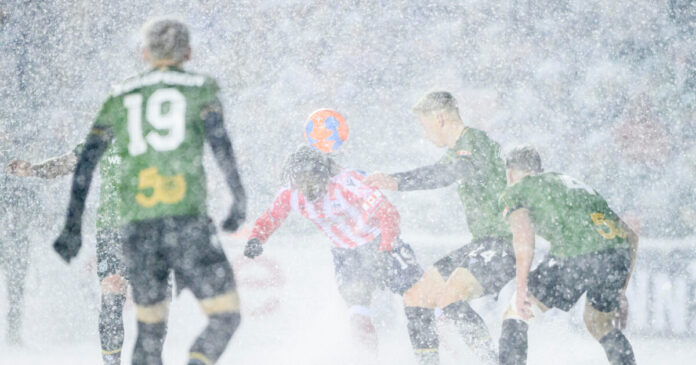 Η πορτοκαλί μπάλα ήταν ένα απαραίτητο “εργαλείο” για να παιχτεί το ματς, ενώ δεν έλειψαν και οι στιγμές που επιστρατεύτηκαν και τα φτυάρια χιονιού, για να συνεχιστεί και να ολοκληρωθεί το ματς, μιας και υπήρξαν στιγμές που οι αστράγαλοι των ποδοσφαιριστών χάνοντας στο χιόνι.