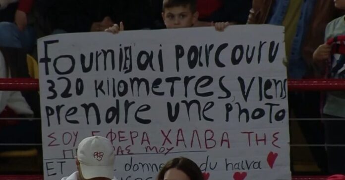 Κι αυτό γιατί ένας οπαδός του Ολυμπιακού εμφανίστηκε με πλακάτ για τον Εβάν Φουρνιέ, υποστηρίζοντας ότι έκανε 320 χιλιόμετρα για να τον δει από κοντά και να βγάλει μαζί του μία φωτογραφία.