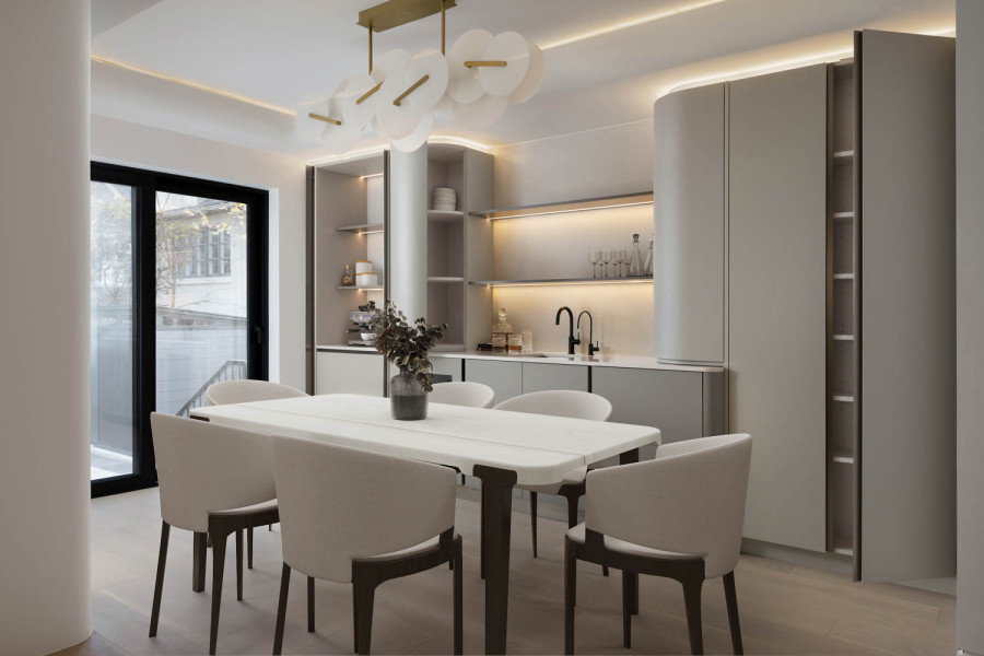 Στην τραπεζαρία, που βρίσκεται πίσω από το σαλόνι, μια επιμήκης ξύλινη επιφάνεια πλαισιωμένη από σύγχρονες καρέκλες με υφασμάτινες επενδύσεις δημιουργεί το ιδανικό περιβάλλον για οικογενειακά δείπνα. Πάνω από το τραπέζι, ένα γλυπτό φωτιστικό με οργανικές καμπύλες λειτουργεί ως σημείο αναφοράς και συνδέει οπτικά τους υπόλοιπους χώρους.