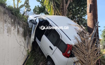 Χανιά: Τροχαίο με αυτοκίνητο να «σκαρφαλώνει» κάθετα σε τοίχο, φωτογραφίες