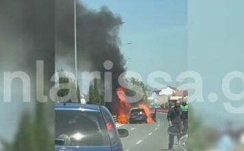 Λάρισα: Αυτοκίνητο τυλίχθηκε στις φλόγες στη μέση του δρόμου – Δείτε...
