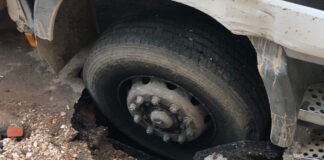 Απορριμματοφόρο παγιδεύτηκε σε μεγάλη λακκούβα στον Άγιο Δημήτριο
