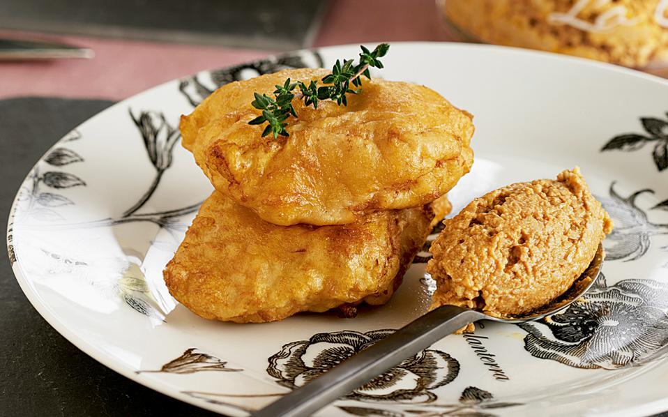 Τηγανητός μπακαλιάρος σε αφράτο κουρκούτι με κόκκινη σκορδαλιά