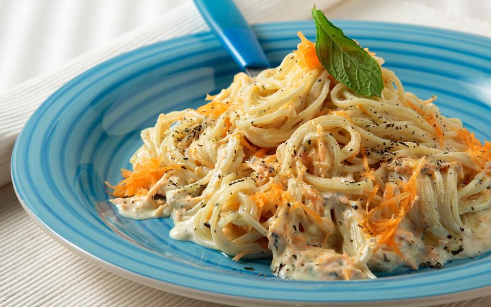 Σπαγκέτι με σκορδάτη σάλτσα γιαουρτιού