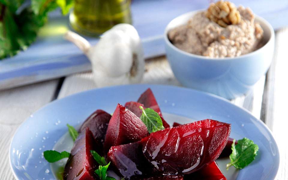 Παντζάρια ψητά με μακεδονίτικη καρυδοσκορδαλιά