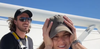 Τρομαγμένη η Μαρία Σάκκαρη στην οροφή του σταδίου του Πέρθ, μαζί...