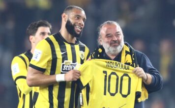 Ο Αρόλντ Μουκουντί συμπλήρωσε 100 αγώνες με την ΑΕΚ και ο Μάριος Ηλιόπουλος του έδωσε αναμνηστική φανέλα