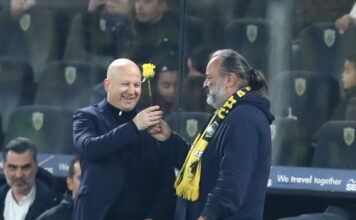 Ο Μάριος Ηλιόπουλος έδωσε κίτρινο τριαντάφυλλο στον Μάρκο Νίκολιτς μετά τη νίκη της ΑΕΚ επί της Κηφισιάς
