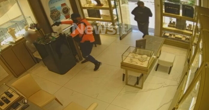 Όπως φαίνεται στα πλάνα από την ληστεία – μαμούθ στη Σάνη Χαλκιδικής, οι 2 δράστες φορώντας μάσκες, κουκούλες και γάντια, μπαίνουν στο κοσμηματοπωλείο με σηκωμένα τα όπλα και σημαδεύουν τους 2 υπαλλήλους. Ξεκινούν να φωνάζουν και να απειλούν, αναγκάζοντας τους εργαζόμενους να πέσουν με τα γόνατα στο έδαφος. Ενώ ο ένας δράστης συνεχίζει να σημαδεύει με το όπλο, ο 2ος αδειάζει από τις βιτρίνες τα πανάκριβα κοσμήματα της επιχείρησης που βρίσκεται μέσα σε γνωστό ξενοδοχειακό συγκρότημα της περιοχής.