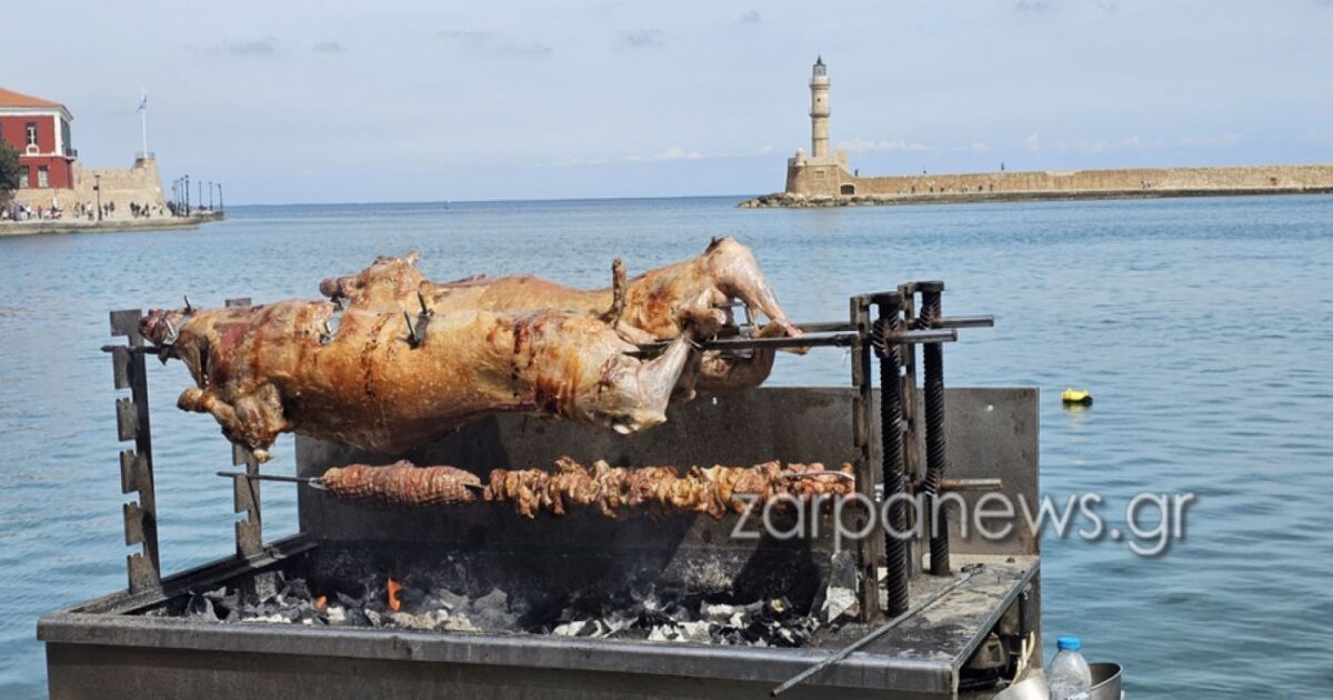 Τηρώντας το έθιμο του Πάσχα, οι καταστηματάρχες των Χανίων έστησαν τις σούβλες με τα αρνιά, το κοκορέτσι και το παραδοσιακό κρητικό αντικριστό.