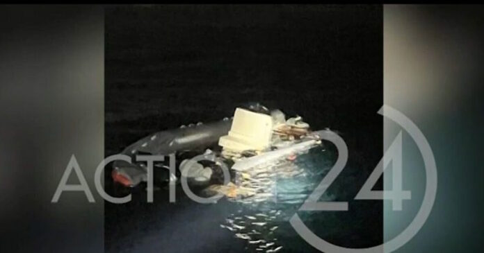 Συγκεκριμένα, στις φωτογραφίες που προέβαλε το Action24, φαίνεται το φουσκωτό με τους μετανάστες έξω από τη Χίο να είναι μισοβυθισμένο από την μπροστά δεξιά πλευρά του.