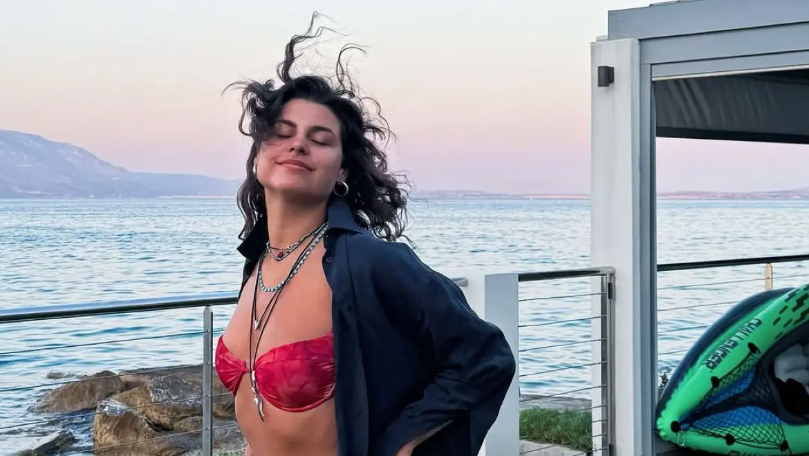 Αυτή τη φορά ποζάρει με κόκκινο μπικίνι στην παραλία, με θέα το απέραντο γαλάζιο και φόντο το Βραχάτι, υπό το φως του ηλιοβασιλέματος.