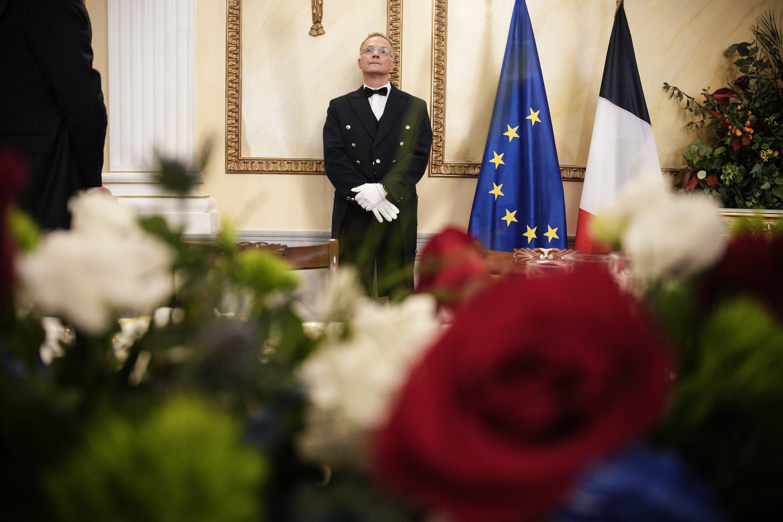 Κατά τη διάρκεια του δείπνου ο Έλληνας πρωθυπουργός συνομίλησε με την Μπριζίτ Μακρόν. Από την άλλη πλευρά του τραπεζιού, καθόταν ο υπουργός Οικονομίας και πρόεδρος του Eurogroup, Κυριάκος Πιερρακάκης και η πρόεδρος της Επιτροπής Εξωτερικών και Άμυνας στην Ελληνική Βουλή, Ντόρα Μπακογιάννη.