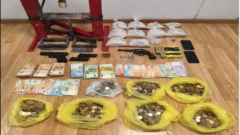 Συνολικά, από τις έρευνες βρέθηκαν και κατασχέθηκαν πιστόλι με δύο γεμιστήρες και 19 φυσίγγια, περίστροφο με τέσσερα φυσίγγια, 129 φυσίγγια, 38.702,85 ευρώ, μικροποσότητα κάνναβης και δύο κινητά τηλέφωνα.