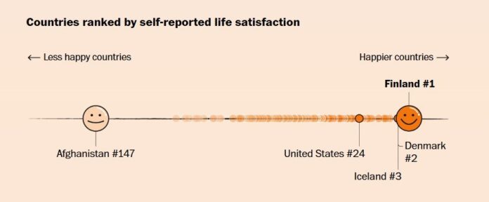 Να πώς μοιάζει η ευτυχία σε όλο τον κόσμο, σύμφωνα με δημοσίευμα της αμερικανικής εφημερίδας Washington Post, που βασίζεται σε στοιχεία τόσο της ετήσιας Έκθεσης Παγκόσμιας Ευτυχίας όσο και σε έρευνες που έχουν γίνει σε εθνικό επίπεδο ανά τον κόσμο.
