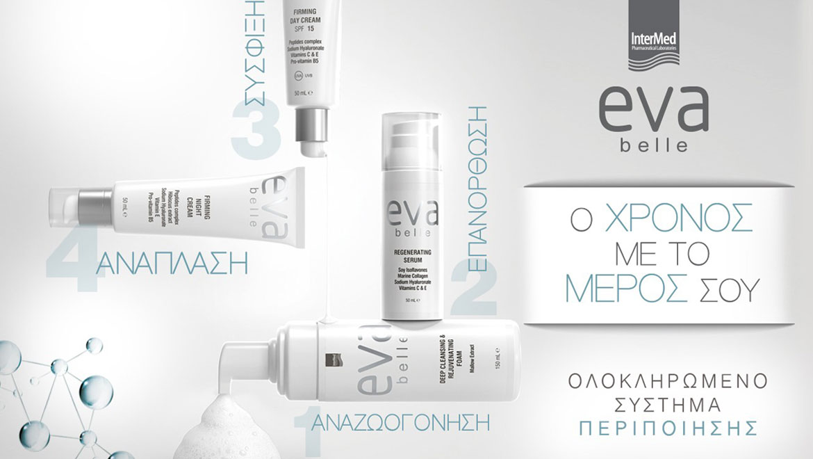 Μπορείτε να αντιμετωπίσετε αποτελεσματικά τα σημάδια γήρανσης και να βελτιώσετε την υγεία και την εμφάνιση του δέρματός σας χρησιμοποιώντας τη σειρά Eva Belle της φαρμακευτικής εταιρείας InterMed. Με την Eva Belle δημιουργείτε μια αποτελεσματική ρουτίνα περιποίησης βασισμένη στις ανάγκες σας.