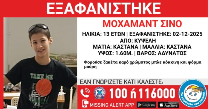 Συναγερμός έχει σημάνει στις αρχές για την εξαφάνιση του 13χρονου Μοχαμάντ Σινό από την περιοχή της Κυψέλης, με το «Χαμόγελο του Παιδιού» να βγάζει άμεσα ανακοίνωση για το περιστατικό.