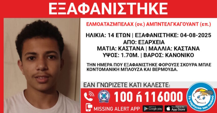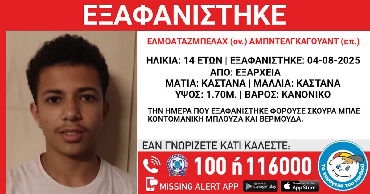 Την εξαφάνιση του Ελμοαταζμπελάχ Αμπντελγκαγουάντ, ηλικίας 14 ετών, αιγυπτιακής καταγωγής, από τα Εξάρχεια ανακοίνωσε το «Χαμόγελο του Παιδιού», νωρίτερα την Τρίτη (05.08.2025).