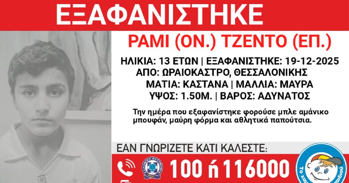 Το «Χαμόγελο του Παιδιού» ενημερώθηκε για την εξαφάνιση του 13χρονου Τζέντο Ραμί από το Ωραιόκαστρο και προχώρησε άμεσα στη δημοσιοποίηση των στοιχείων του, κατόπιν εισαγγελικής εντολής, καθώς ενδέχεται να συντρέχουν λόγοι που θέτουν τη ζωή του σε κίνδυνο.