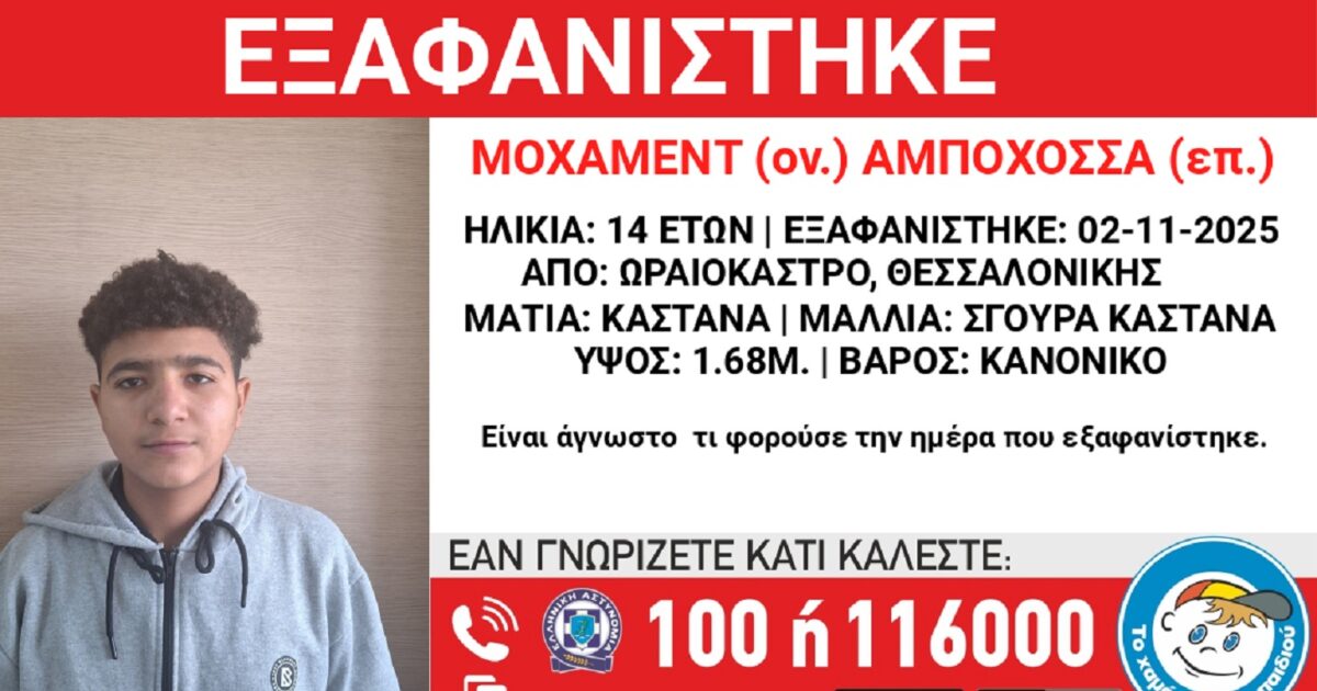 Εξαφανίστηκε το μεσημέρι της Κυριακής 2 Νοεμβρίου ένας 14χρονος από δομή φιλοξενίας στη Θεσσαλονίκη, σύμφωνα με το «Χαμόγελο του Παιδιού».