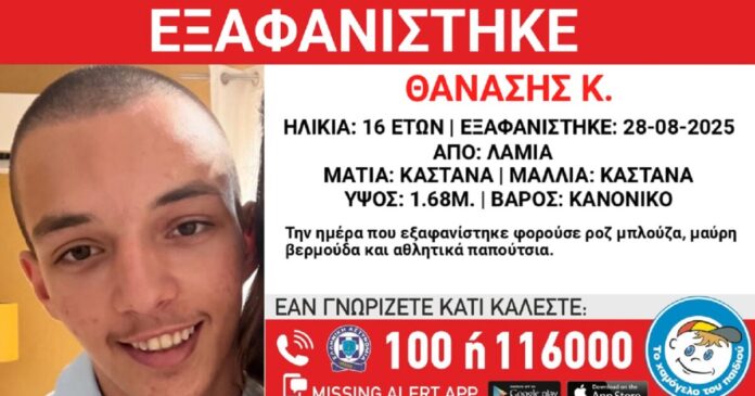 Συναγερμός έχει σημάνει στη Λαμία από την εξαφάνιση του 16χρονου Θανάσης το μεσημέρι της Πέμπτης 28 Αυγούστου σύμφωνα με το Χαμόγελο του Παιδιού.