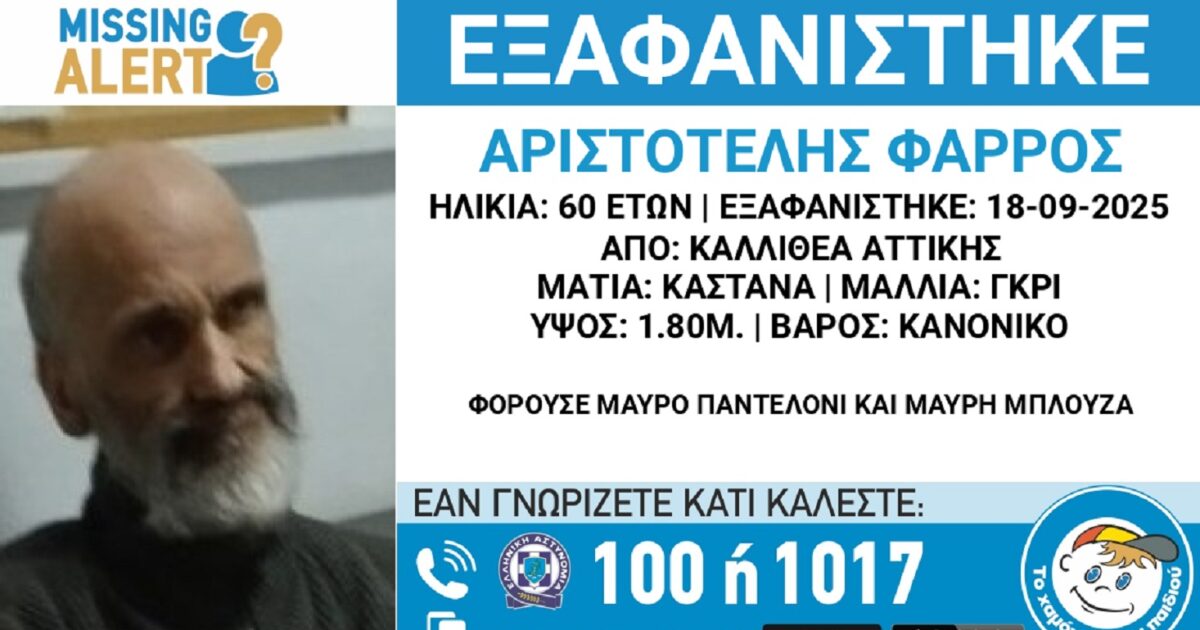 Αγωνία για τον 6χρονο Αριστοτέλη Φάρρο ο οποίος εξαφανίστηκες από την Καλλιθέα στις 18 Σεπτεμβρίου, με το «Χαμόγελο του Παιδιού» να ζητά πληροφορίες.