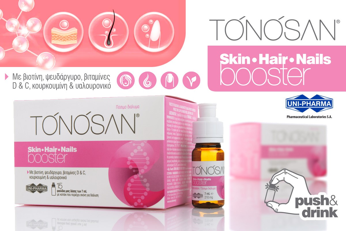 Με το TONOSAN® Skin Hair Nails Booster, αποχαιρετάμε το θαμπό δέρμα, τα αδύναμα μαλλιά και τα εύθραυστα νύχια. Καλωσορίζουμε την υγεία και την αναζωογόνηση!
