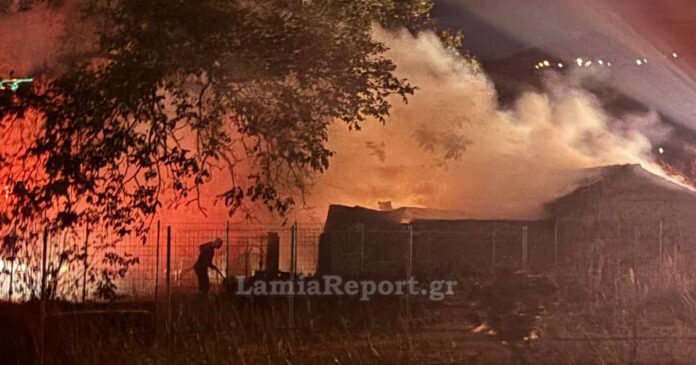 Η φωτιά ξεκίνησε από το συγκεκριμένο κτίριο, που είναι κοντά σε σπίτια, στον δρόμο που περνά από το Γυμνάσιο – Λύκειο Μακρακώμης στη Φθιώτιδα.