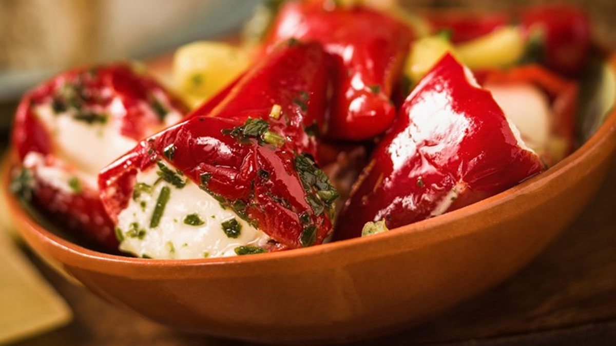 Για το σερβίρισμα, απλώνουμε την κρέμα σε μια πιατέλα, τοποθετούμε από πάνω τις πιπεριές και ολοκληρώνουμε με λίγο ελαιόλαδο.
