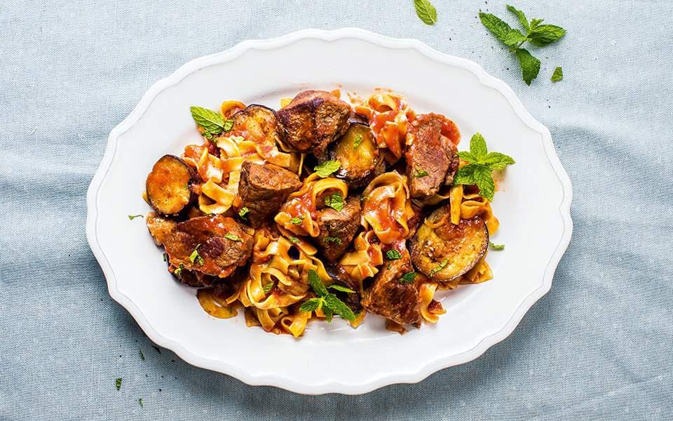 Ρίχνουμε περίπου 1.200 ml ζεστό νερό, ανακατεύουμε και σκεπάζουμε με καπάκι ή αλουμινόχαρτο. Ψήνουμε στον φούρνο για 1 ώρα ή μέχρι να μαλακώσει αρκετά το κρέας. Στο ίδιο τηγάνι όπου σοτάραμε το κρέας (για να μη λερώνουμε πολλά σκεύη) ζεσταίνουμε σε μέτρια φωτιά το υπόλοιπο λάδι και σοτάρουμε τις μελιτζάνες για 3-4 λεπτά, μέχρι να ροδίσουν.