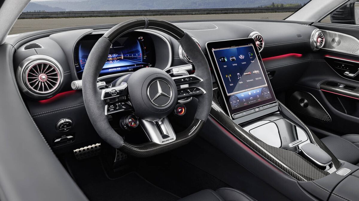 Κατά τα άλλα υπάρχει ψηφιακός πίνακας οργάνων 12,3 ιντσών και οθόνη αφής 11,9 ιντσών σε κάθετη διάταξη για το εξελιγμένο σύστημα infotainment, ενώ χαρακτηριστικά είναι τόσο τα σπορ καθίσματα με τα ενσωματωμένα προσκέφαλα όσο και το τιμόνι AMG Performance.