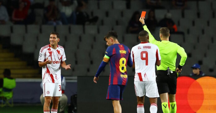 Ο Σαντιάγο Έσε αποβλήθηκε με δεύτερη κίτρινη κάρτα για φάουλ στον Κασάδο της Μπαρτσελόνα, με τον διαιτητή να δίνει ένα σφύριγμα που εξοργίζει τους ανθρώπους του Ολυμπιακού.