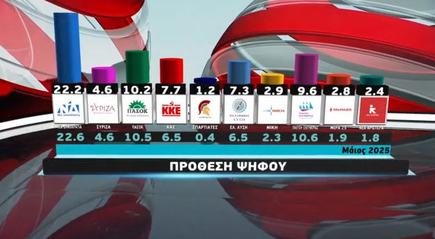 Στην πρόθεση ψήφου η ΝΔ (22,2%) καταγράφει οριακές απώλειες από τον περασμένο Μάιο, ομοίως και το ΠΑΣΟΚ (10,2%) ενώ το κόμμα της Ζωής Κωνσταντοπούλου χάνει μία ολόκληρη μονάδα και πέφτει στην τρίτη θέση (9,6%). Κερδισμένοι είναι ΚΚΕ (7,7%) με αύξηση 1,2% και Ελληνική Λύση (7,3%) με αύξηση 0,8%. Ο ΣΥΡΙΖΑ είναι στάσιμος (4,6%) ενώ αυξήθηκε η πρόθεση ψήφου για Νέα Αριστερά (2,4%) και ΜέΡΑ25 (2,8%).
