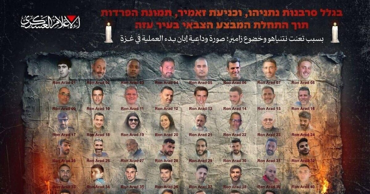 Η αφίσα της Χαμάς με τους ομήρους συνοδεύεται από ένα κείμενο το οποίο γράφει… «Λόγω της άρνησης του Νετανιάχου και της υποταγής του [αρχηγού του Γενικού Επιτελείου Εγιάλ] Ζαμίρ, μια αποχαιρετιστήρια εικόνα καθώς ξεκινά η στρατιωτική επιχείρηση στην Πόλη της Γάζας».