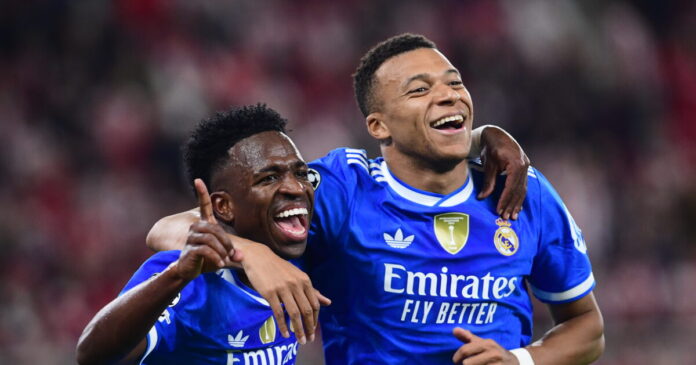 Εμπαπέ και Βίνι πανηγυρίζουν το 4ο γκολ της Ρεάλ (ΓΙΩΡΓΟΣ ΜΑΤΘΑΙΟΣ / EUROKINISSI)