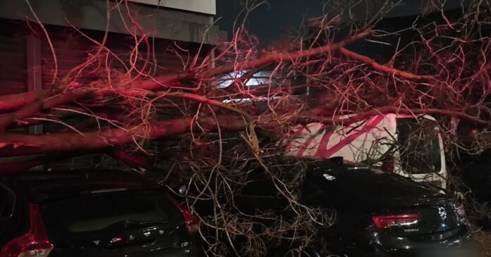 Μάλιστα, στην οδό Πειραιώς 178 ένα δέντρο έπεσε και καταπλάκωσε τέσσερα αυτοκίνητα.