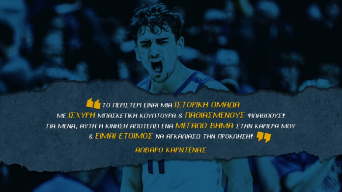 «Είμαι πραγματικά ενθουσιασμένος που θα ενταχθώ στο Περιστέρι και θα αγωνιστώ στο ελληνικό πρωτάθλημα. Είναι μια ιστορική ομάδα, με ισχυρή μπασκετική κουλτούρα και παθιασμένους φιλάθλους. Για μένα, αυτή η κίνηση αποτελεί ένα μεγάλο βήμα στην καριέρα μου και είμαι έτοιμος να αγκαλιάσω την πρόκληση» υποστήριξε ο Άλβαρο Καρντένας.