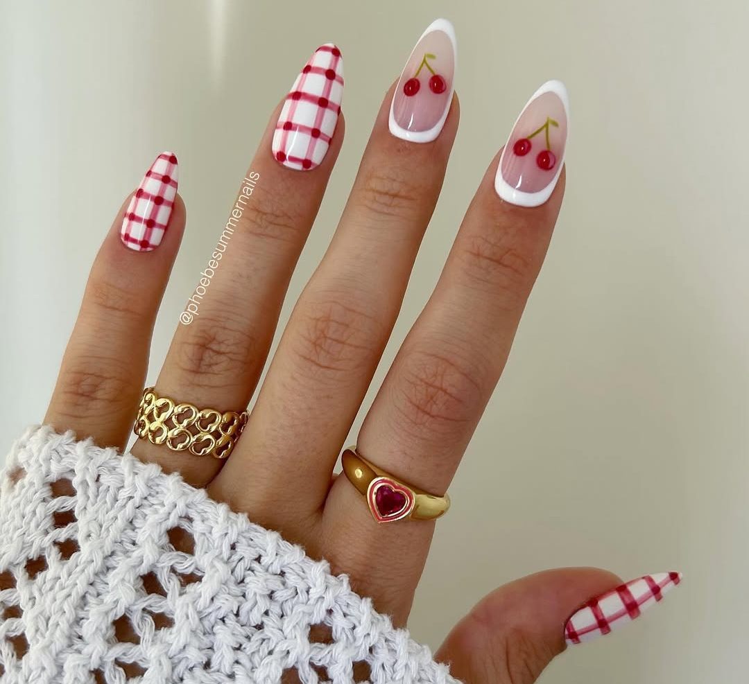 Εάν θέλετε να πετύχετε ένα παιχνιδιάρικο μανικιούρ, δοκιμάστε να συνδυάσετε το καρό print με τα κεράσια, μια ακόμη μεγάλη τάση του φετινού καλοκαιριού. Ζητήστε από τη μανικιουρίστ σας να δημιουργήσει σε μερικά από τα νύχια σας το καρό pattern σε ροζ και λευκό και σε μερικά άλλα να ζωγραφήσει ή και να κολλήσει μικροσκοπικά κερασάκια.
