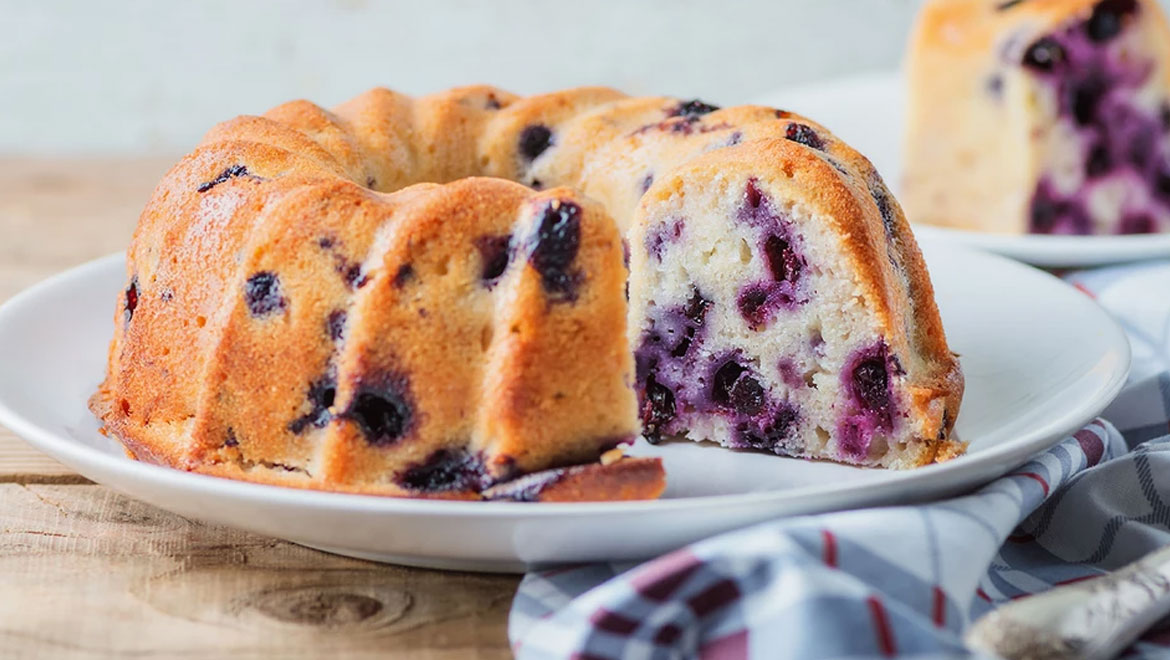 Επικαλύψτε τα μύρτιλα με λίγο αλεύρι και προσθέστε τα στο μείγμα. Μεταφέρετε το μείγμα στην προετοιμασμένη φόρμα και απλώστε το ομοιόμορφα. Προσθέστε από πάνω μερικά ακόμη μύρτιλα (προαιρετικά).