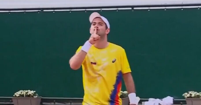 Με τη λήξη του αγώνα του, αφού πέτυχε τον τελευταίο πόντο, ο 25χρόνος τενίστας απάντησε στις αποδοκιμασίες των οπαδών και πανηγύρισε προκλητικά βάζοντας το δάχτυλό του στα χείλη του, κάνοντας μία χειρονομία σιωπής προς τις κερκίδες.