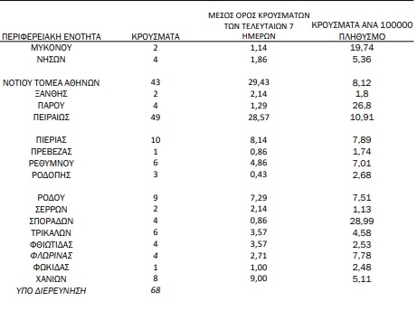 Ο συνολικός αριθμός των κρουσμάτων ανέρχεται σε 416.195 (ημερήσια μεταβολή +0.2%), εκ των οποίων 51.2% άνδρες. Με βάση τα επιβεβαιωμένα κρούσματα των τελευταίων 7 ημερών, 28 θεωρούνται σχετιζόμενα με ταξίδι από το εξωτερικό και 1.102 είναι σχετιζόμενα με ήδη γνωστό κρούσμα.