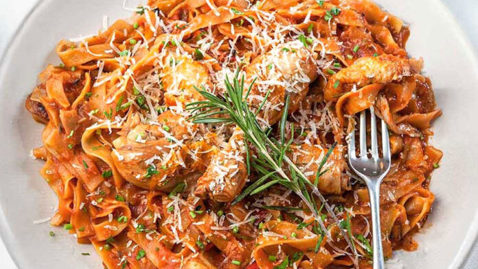Σερβίρετε τα ζυμαρικά στη σάλτσα, τοποθετήστε το κοτόπουλο από πάνω και πασπαλίστε με μπόλικο κεφαλοτύρι.