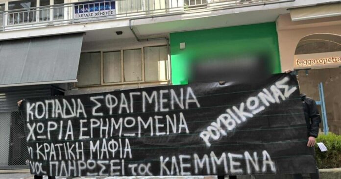 Τα μέλη του Ρουβίκωνα σήκωσαν και πανό έξω από το γραφείο του βουλευτή της Νέας Δημοκρατίας, Χρήστου Κέλλα, γράφοντας συνθήματα για τις παράνομες επιδοτήσεις του ΟΠΕΚΕΠΕ αλλά κι για την ευλογιά των αιγοπροβάτων που έχει τσακίσει τους κτηνοτρόφους.