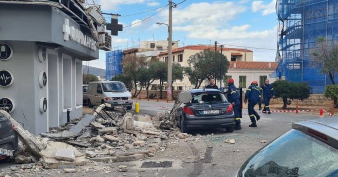 Από τα συντρίμμια του μπαλκονιού που κατέρρευσε, προκλήθηκαν σοβαρές ζημιές στα παρκαρισμένα αυτοκίνητα, ενώ να σημειωθεί ότι στον κάτω όροφο βρίσκεται φαρμακείο.