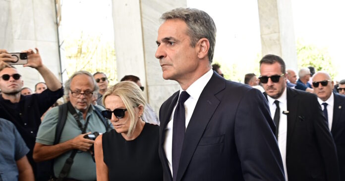 Λίγο πριν τη 1 το μεσημέρι ο Κυριάκος Μητσοτάκης και η σύζυγός της έφτασαν στον Ιερό Ναό Αγίων Θεοδώρων, στο Α’ Κοιμητήριο Αθηνών.