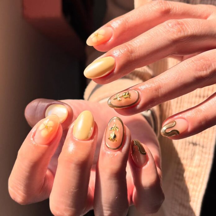 Για μια πιο ρομαντική εκδοχή της τάσης, δοκιμάστε να συνδυάσετε τις καραμελέ αποχρώσεις με μπρονζέ λεπτομέρειες. Μπορείτε δηλαδή να προσθέσετε μερικά τρισδιάστατα στοιχεία, όπως 3D μικροσκοπικά τριαντάφυλλα ή άλλα άνθη σε μπρονζέ τόνους, για να πετύχετε ένα ιδιαίτερο μανικιούρ.