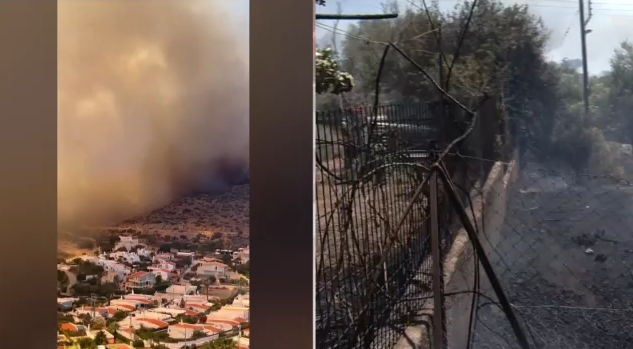 Μέσα στον οικισμό Θυμάρι η φωτιά έχει μπει στις αυλές των σπιτιών και έχει κάψει προαύλιους χώρους.